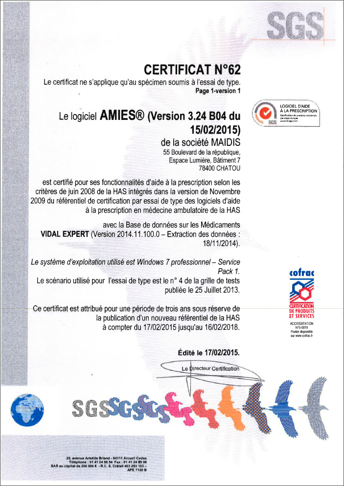 Par ce document, la société MAIDIS certifie que la solution logicielle MAIDIS-Amies (version 3.33 et supérieures) destinée à la gestion des cabinets médicaux (généralistes et spécialistes) et dentaires a subi avec succès les tests de certification :- Logiciel d'aide à la prescription (LAP) le 17/02/2015 (organisme certificateur SGS, base médicamenteuse associée VIDAL Expert), renouvelé le 09/04/2018.
